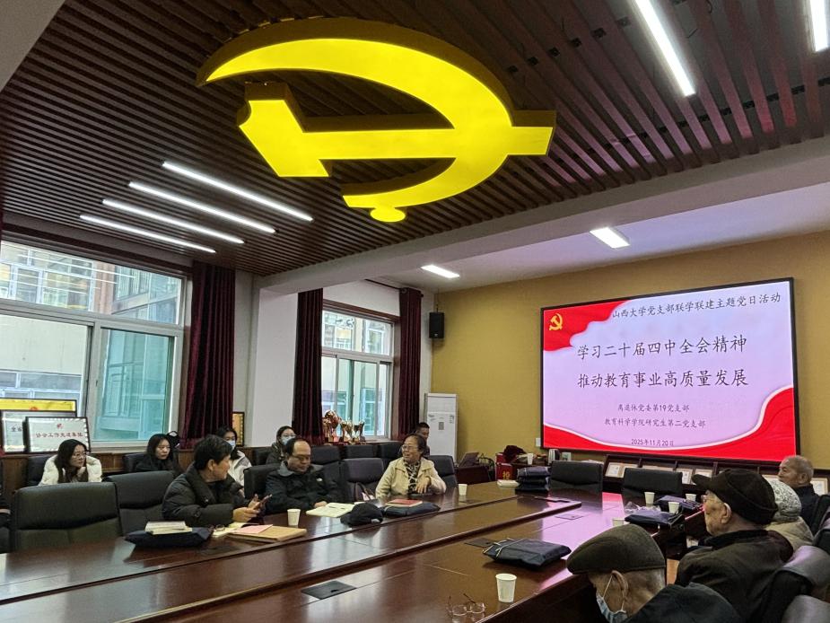 为增强基层党支部的创造力、凝聚力和战斗力,提高党支部的政治功能和组织功能,11月20日,太阳成tyc33455cc研究生第二党支部与离退休党委第19党支部,在老干部活动中心会议室联合举办“学习党的二十届四中全会精神,推动教育事业高质量发展”主题党日活动。来自两个支部的38名党员、入党积极分子共同参加本次主题党日活动。