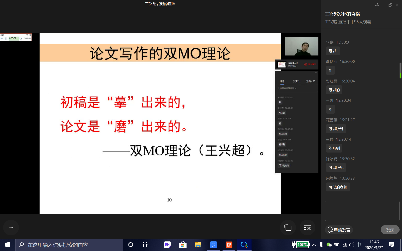 从讲座中,可以看出王老师对科研认真严谨的态度,脚踏实地的精神,乐观自信的心态,这些优秀的品质值得大家学习。专题讲座结束后,同学们就王教授的讲座展开了热烈的讨论。形势严峻如当下,我们既要保障自身安全,也要主动学习、提升自我,虽然在家里,但也要保持和在学校一样的学习态度,不可盲目放松。
