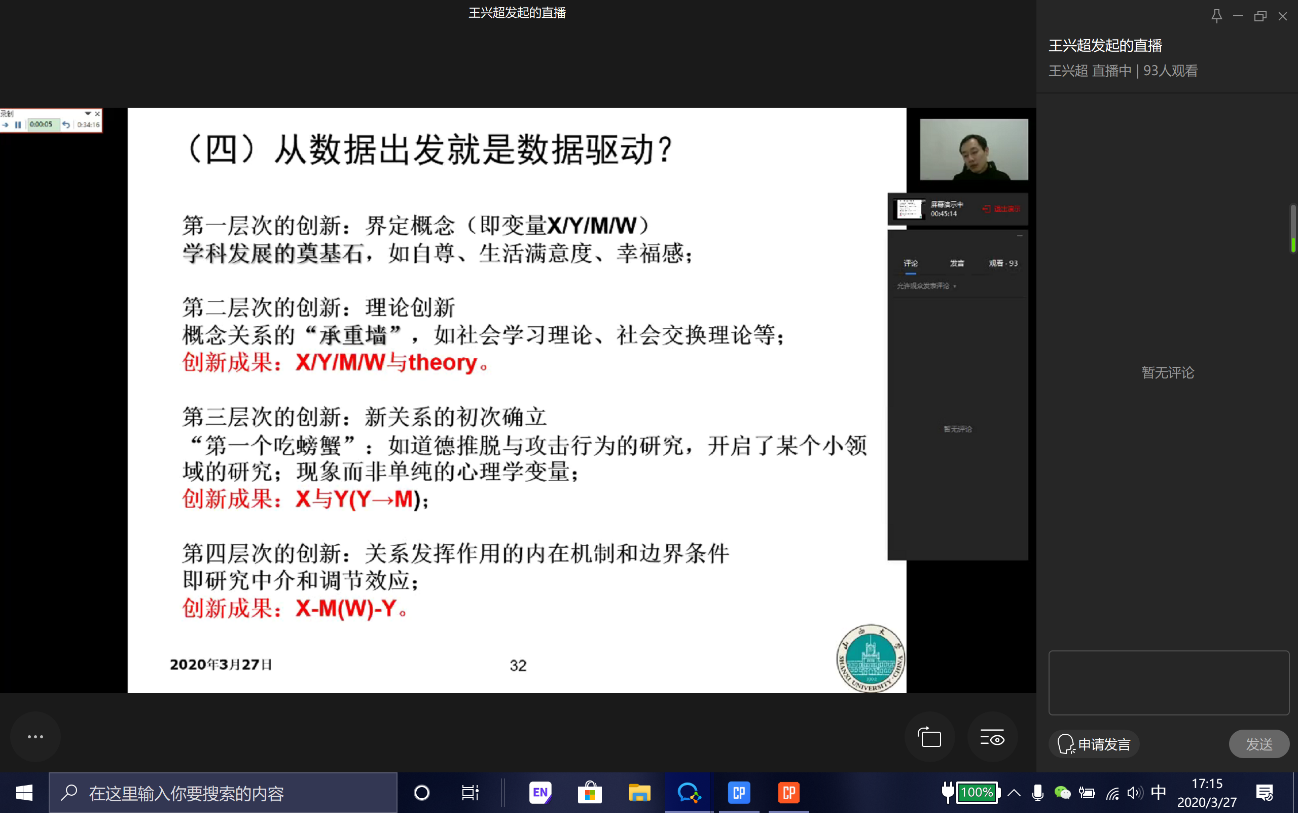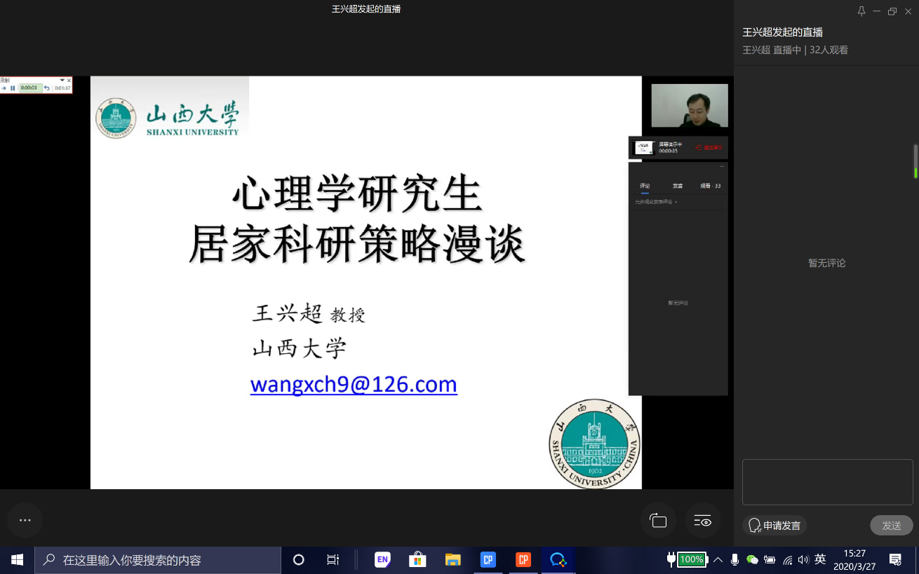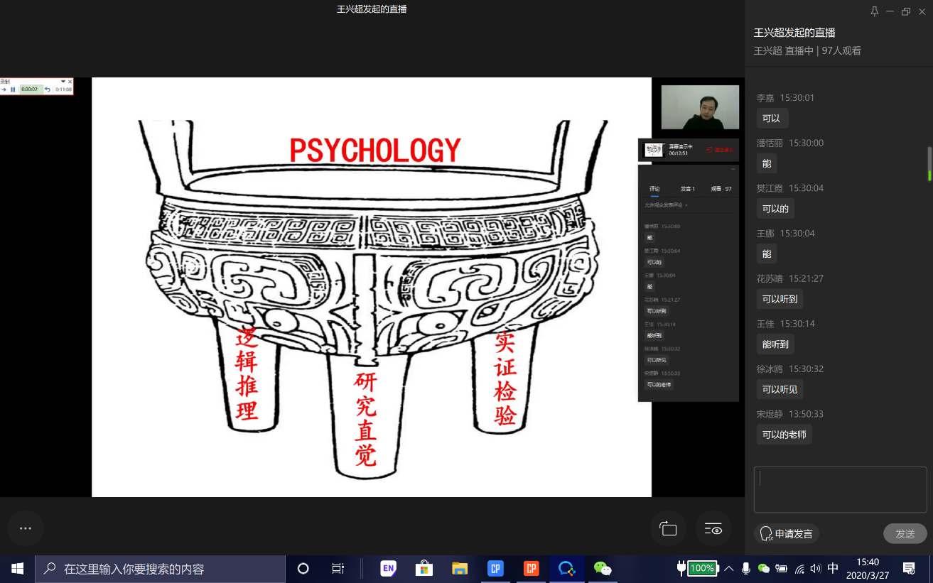 在疫情防控的特殊时期,为了贯彻教育部“停课不停学”的指导精神,更好的培养我院研究生的自主学习和科研能力,学院研究生工作领导小组特邀心理学系王兴超教授于3月27日下午在线上举办了“心理学专业研究生居家科研策略漫谈”专题讲座。副院长徐冰鸥教授、部分老师及心理学专业在读研究生共计90余人参加了本次讲座。